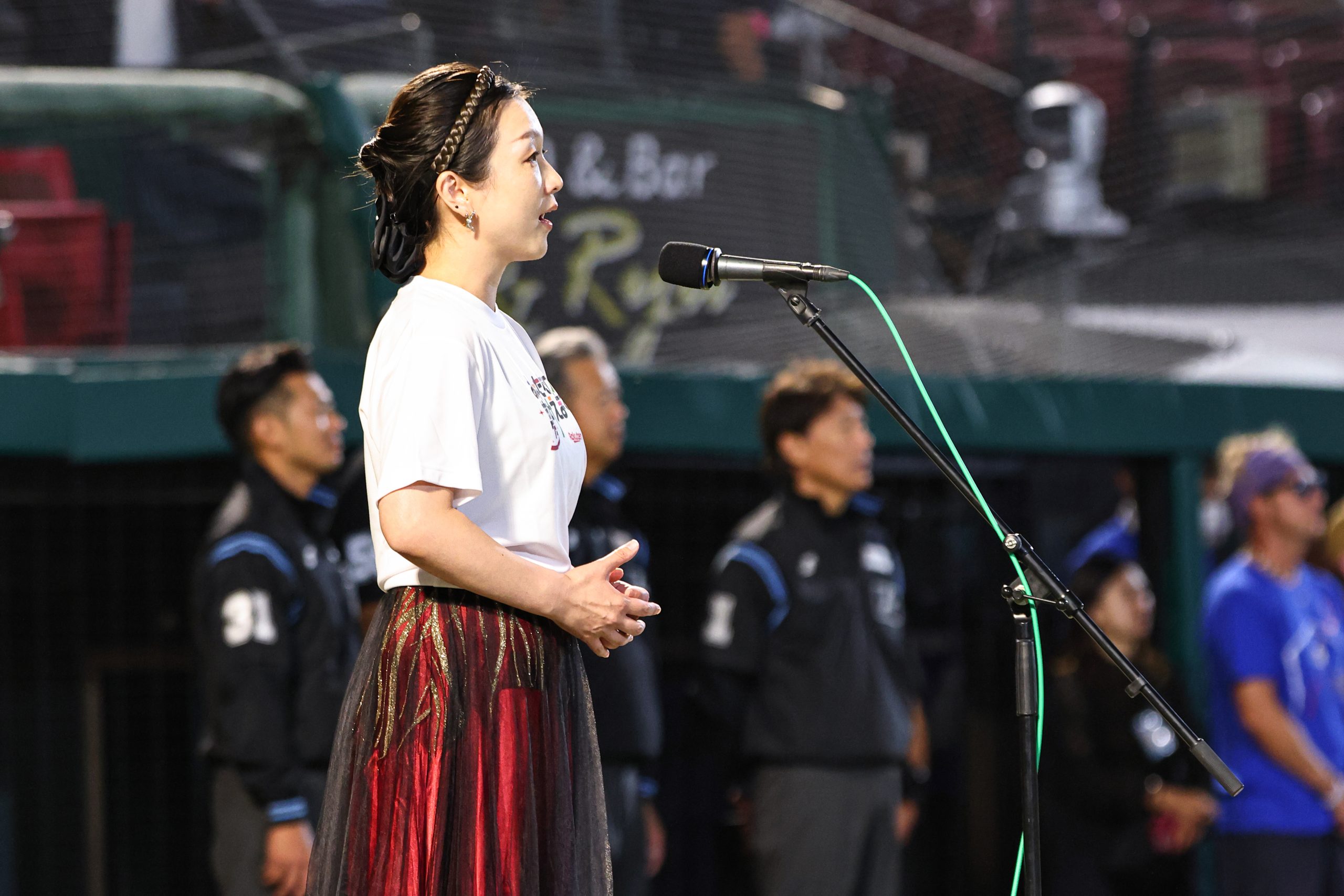 今回の「あなただけの夢叶えます」の当選者は、大勢の前で歌う姿を家族に見てもらいたいという三塚さん。秋晴れとなった9月25日の楽天イーグルスと福岡ソフトバンクの試合前に、大観衆の前で国歌独唱を務めた。結婚前は劇団四季で女優として活躍し、退団した現在もコンサートやミュージカルに出演しているのだが、4歳と0歳の我が子の前で披露する機会が少なく、今回の応募を決めたそう。