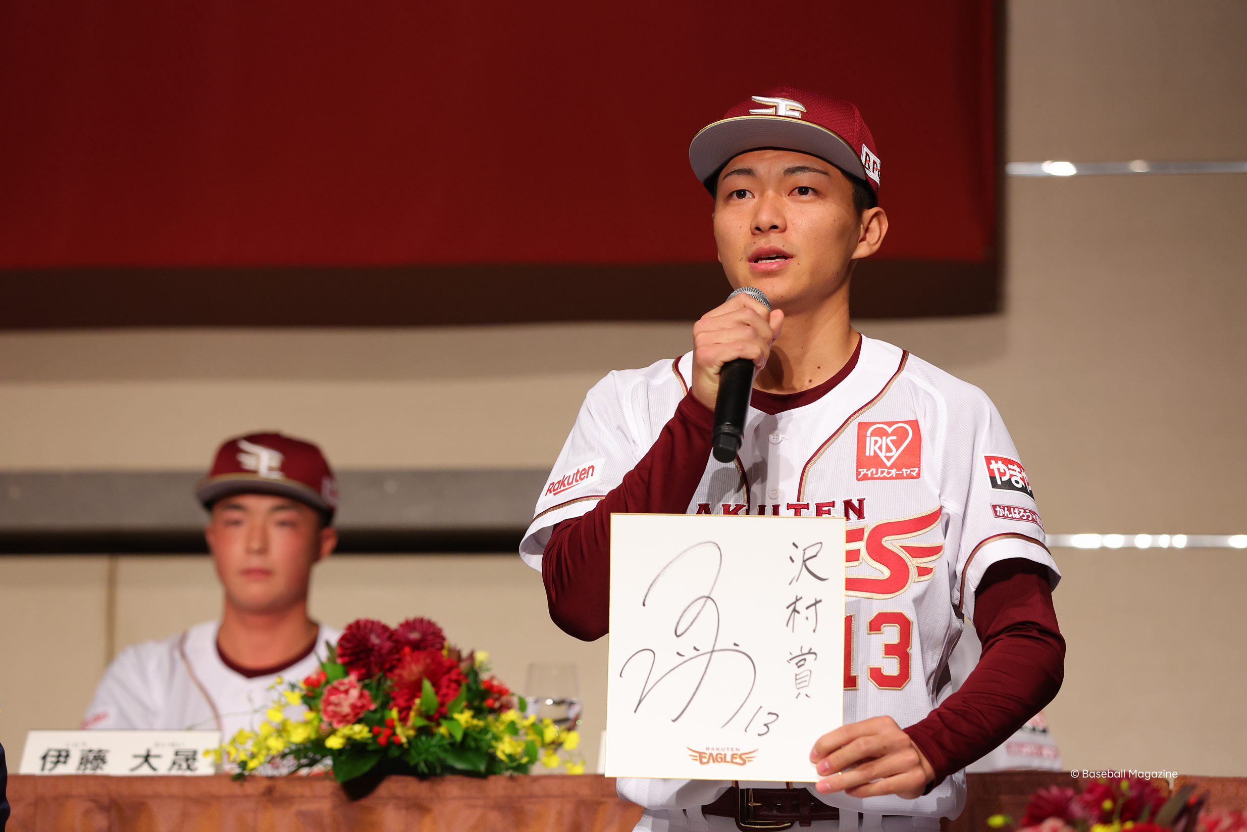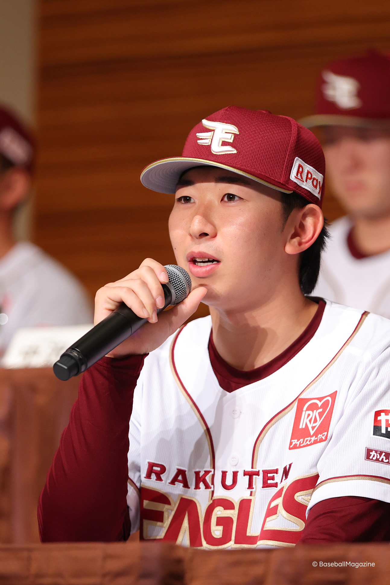 2位指名を受けたのが、秋田県出身で仙台育英高校卒業後に早稲田大学に進学した伊藤樹選手だ。「こうしてまた戻ってきて、東北の一員としてプレーできることに喜びを感じています」と話したとおり、小学6年時には楽天ジュニアにも所属していた、楽天イーグルスゆかりの選手でもある。東北の地で基礎を培ったあと、早稲田大学では東京六大学リーグで通算22勝を挙げ、2024年5月の春季リーグでは史上25人目となるノーヒットノーランを達成。実力、実績ともに十分な即戦力右腕は、1年目から一軍での活躍も期待できる。本人は秋田開催での登板も心待ちにしており、「こまちスタジアムを僕の力で埋められるように必死にがんばりたい」と笑顔で語った。