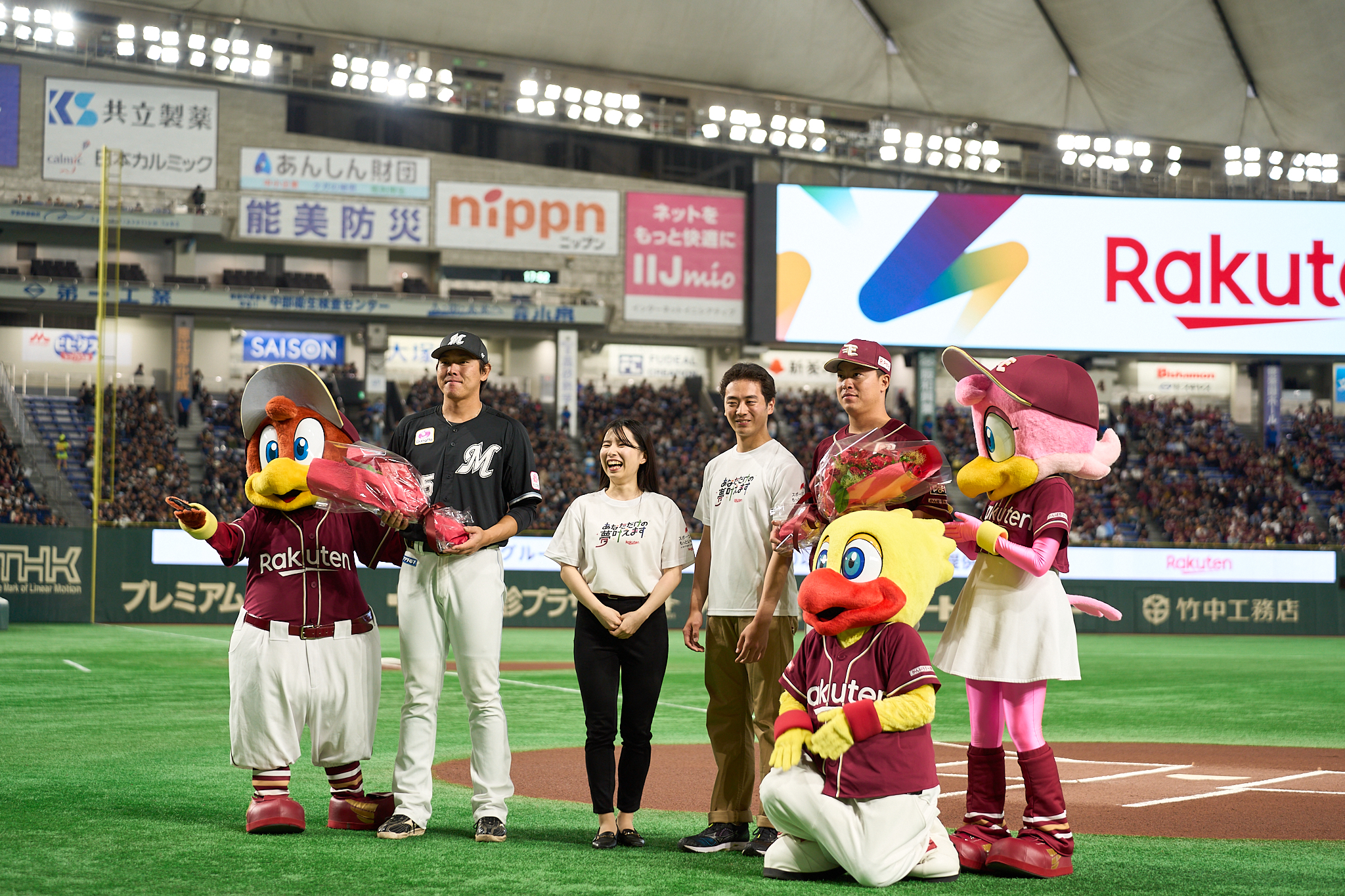 花束を手渡したあとは、楽天イーグルスの渡邊佳明選手、千葉ロッテの安田尚憲選手、マスコットキャラクターのクラッチ、スイッチ、クラッチーナといっしょに記念撮影。