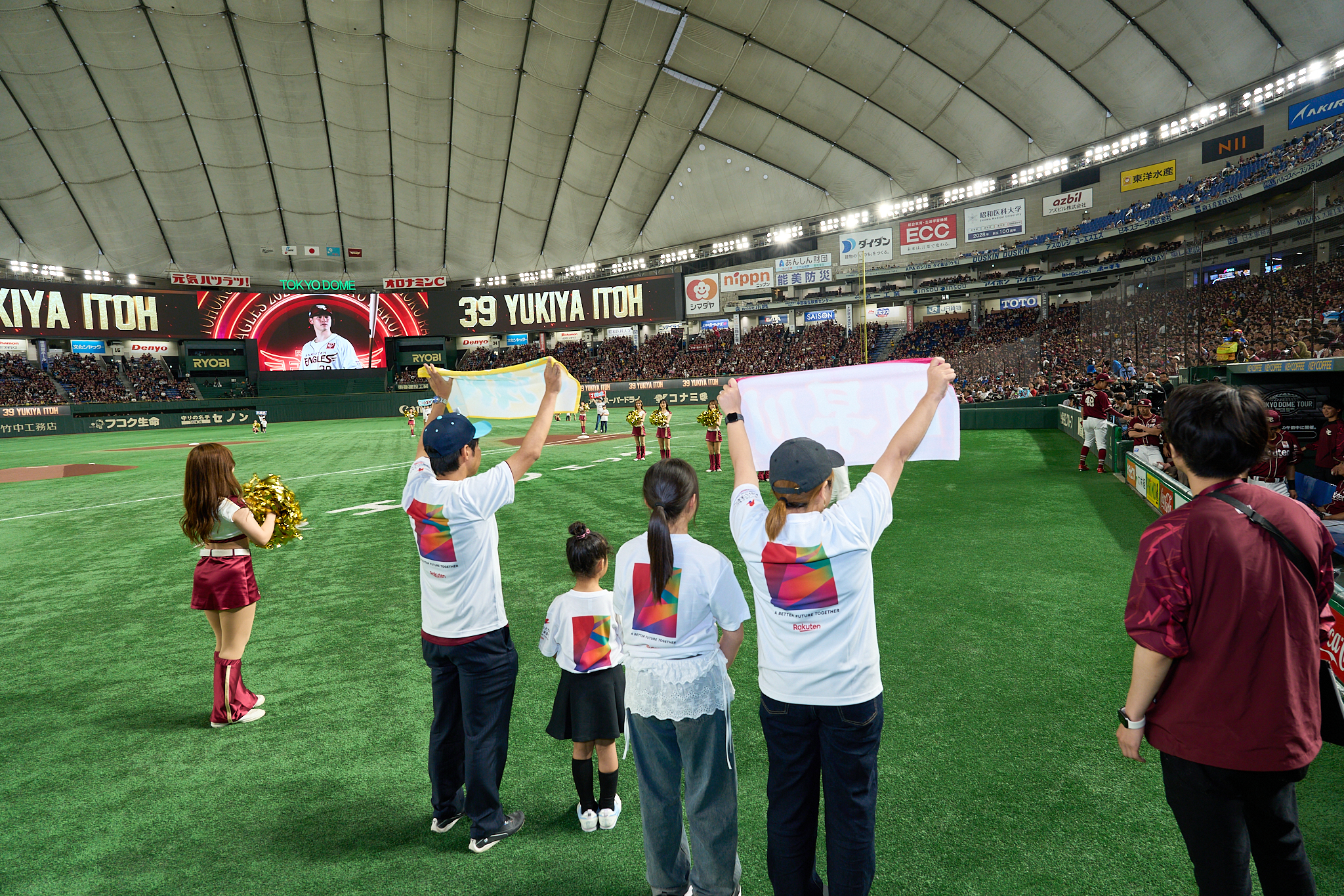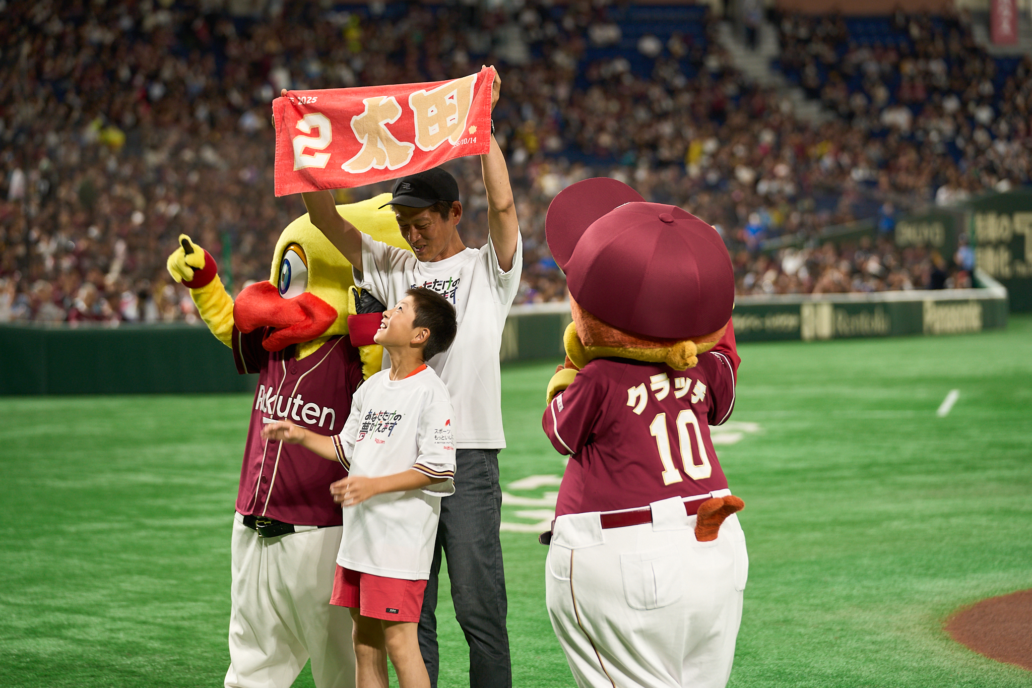 “あな夢”で当選した10組20名のファミリーが、楽天イーグルスのスタメン選手を各ポジションで出迎えるイベント「スターティングファミリー」。大観衆が声援を上げる選手の登場シーンに、MyHEROタオルを掲げながらグラウンドに立つ、まさに“最前線”での応援。親子で心をひとつに通わせながら、スポーツならではの熱量や興奮、一体感を肌で感じられたはず。