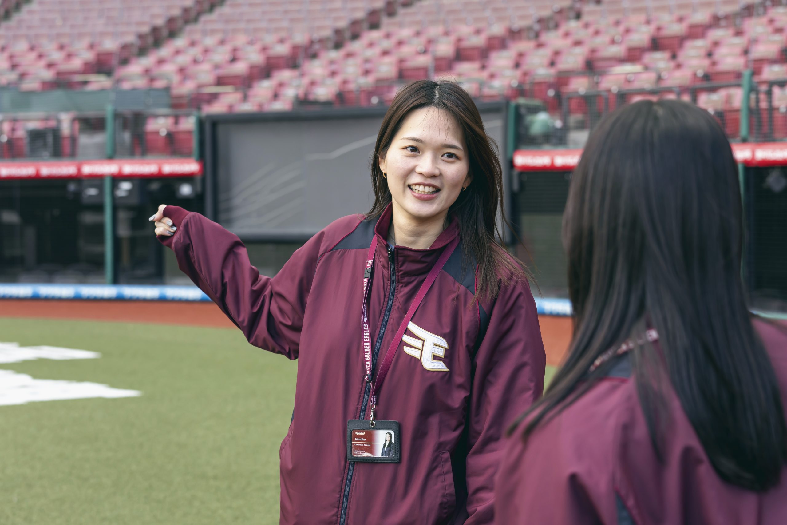 「自分がいちから企画したイベントで、お客さんが実際にそこにいて、体験して、楽しんでくれている姿を直接見られることが、何よりのやりがいです。企画だけ、あるいは現場だけという仕事もあると思いますが、わたしは企画の段階から当日のお客様のお見送りまで一気通貫で携われる。受け入れから案内まで、すべて自分の仕事として向き合えるのは、いまの仕事ならではだと感じています。印象的だったのは、「TOHOKU SMILE ACTION」の一環で小学校や野球教室を訪問したときに出会った男の子のこと。後日、試合会場にも来てくれて、何万人もいるなかからわたしを見つけて『ヤッホー』と声をかけてくれたことです。聞けば、関西弁が印象に残っていたらしくて(笑)。地域での活動がちゃんとつながっていると実感できた、忘れられない瞬間です」