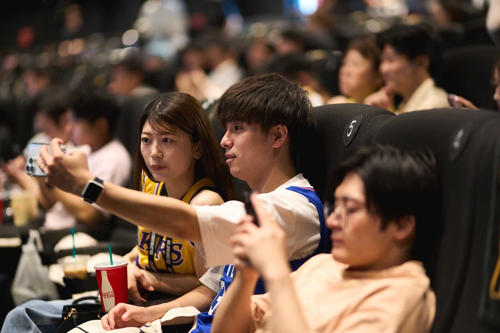 試合開始から前半戦にかけては、手に汗握る展開の連続。「ここでひと息」とハーフタイムに入ると、丸の内ピカデリーの壇上に来季から日本国内のリーグでプレーすることが発表されたばかりの富永啓生選手がスペシャルゲストとして登場した。富永選手は前半戦を振り返り、プロプレーヤーならではの的確なコメントを届ける。また、「こういったイベントに参加する機会はいままでになかったのでとても新鮮です」と話す彼自身、日本で行われるNBAのライブ上映を楽しむひとりだった。その後、ゲームは後半戦へと突入し、ハイレベルな攻防が繰り広げられた。