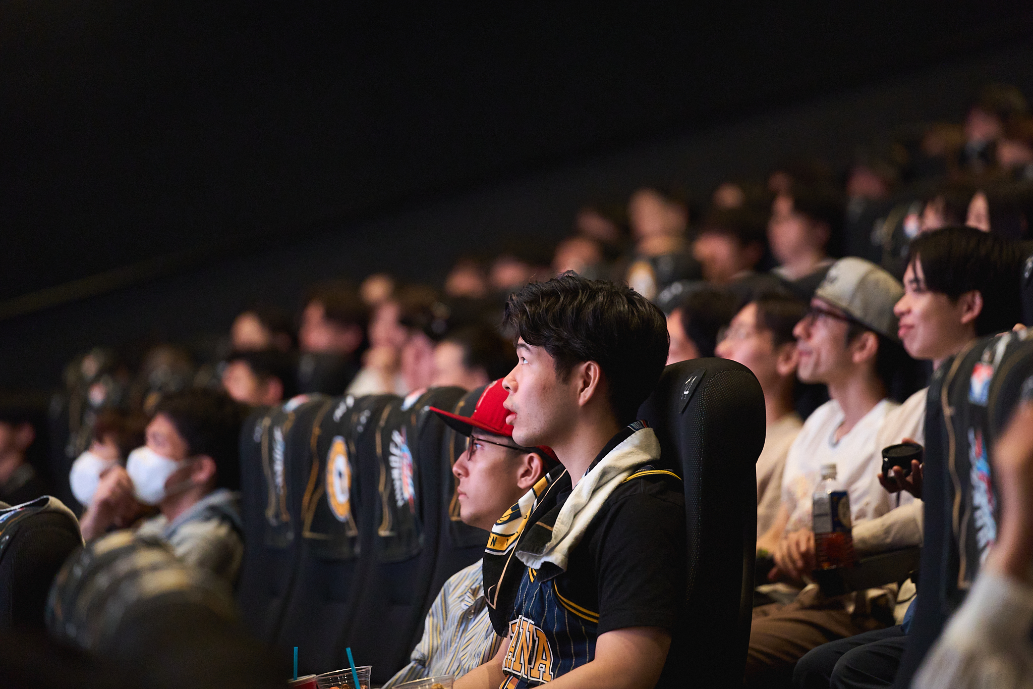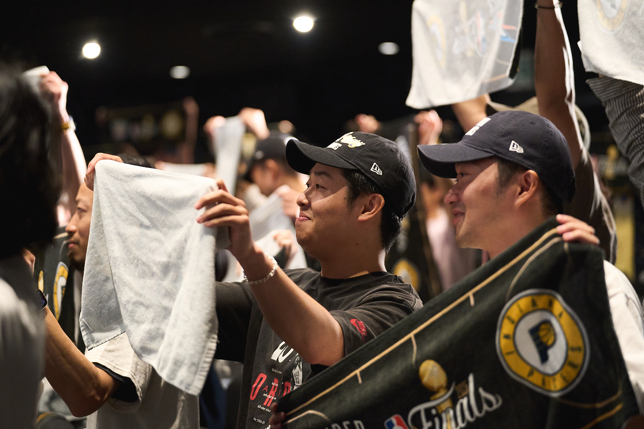 オクラホマシティ・サンダー(以下サンダー)対インディアナ・ペイサーズ(以下ペイサーズ)による、NBAファイナル第3戦目。ゲームの開始時間が日本時刻の平日9時半と朝早くからにもかかわらず、会場の丸の内ピカデリーには好ゲームに期待を寄せるNBAファンたちが集まった。その姿はさまざまで、自身が応援するチームのユニフォームや、自慢のNBAグッズを身につける人はもちろん、そのまま仕事に向かえるような装いの人も多く見られた。