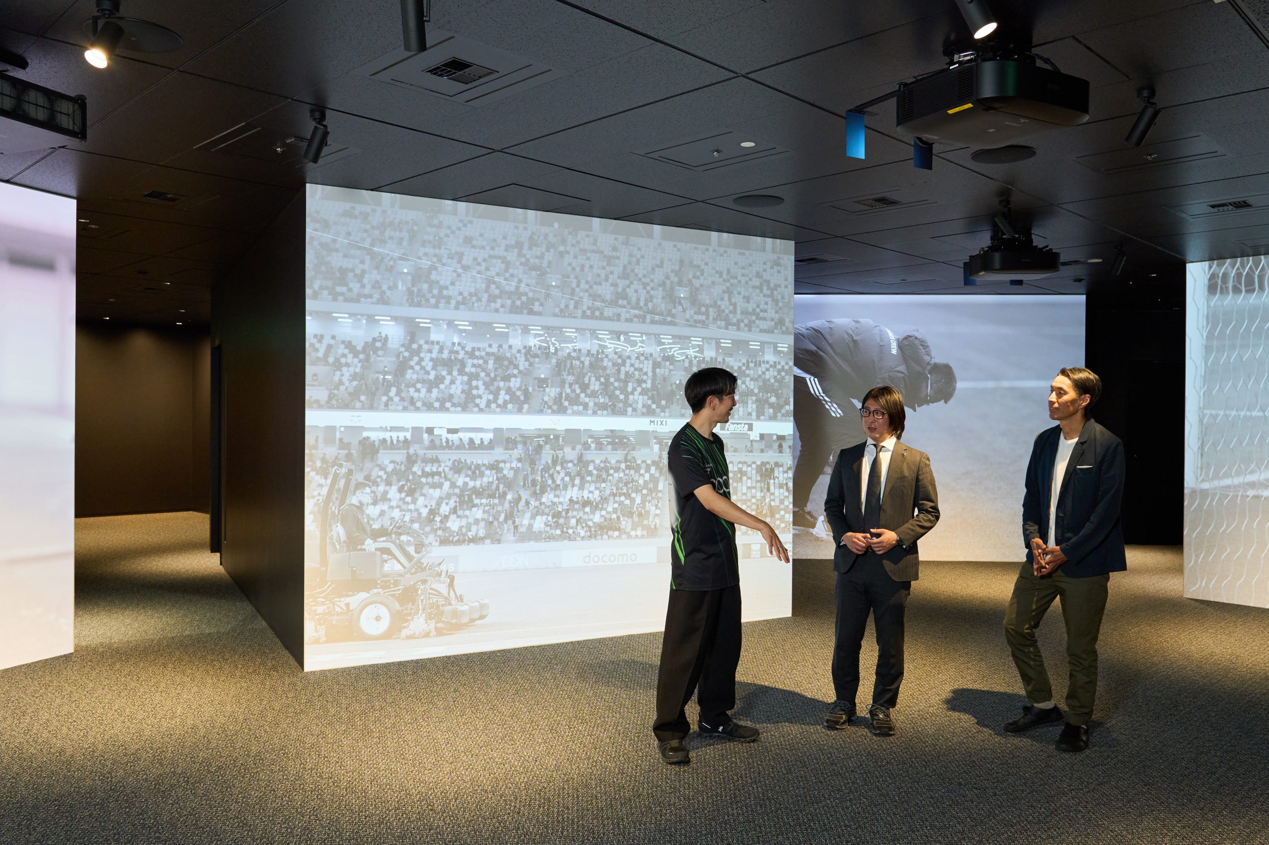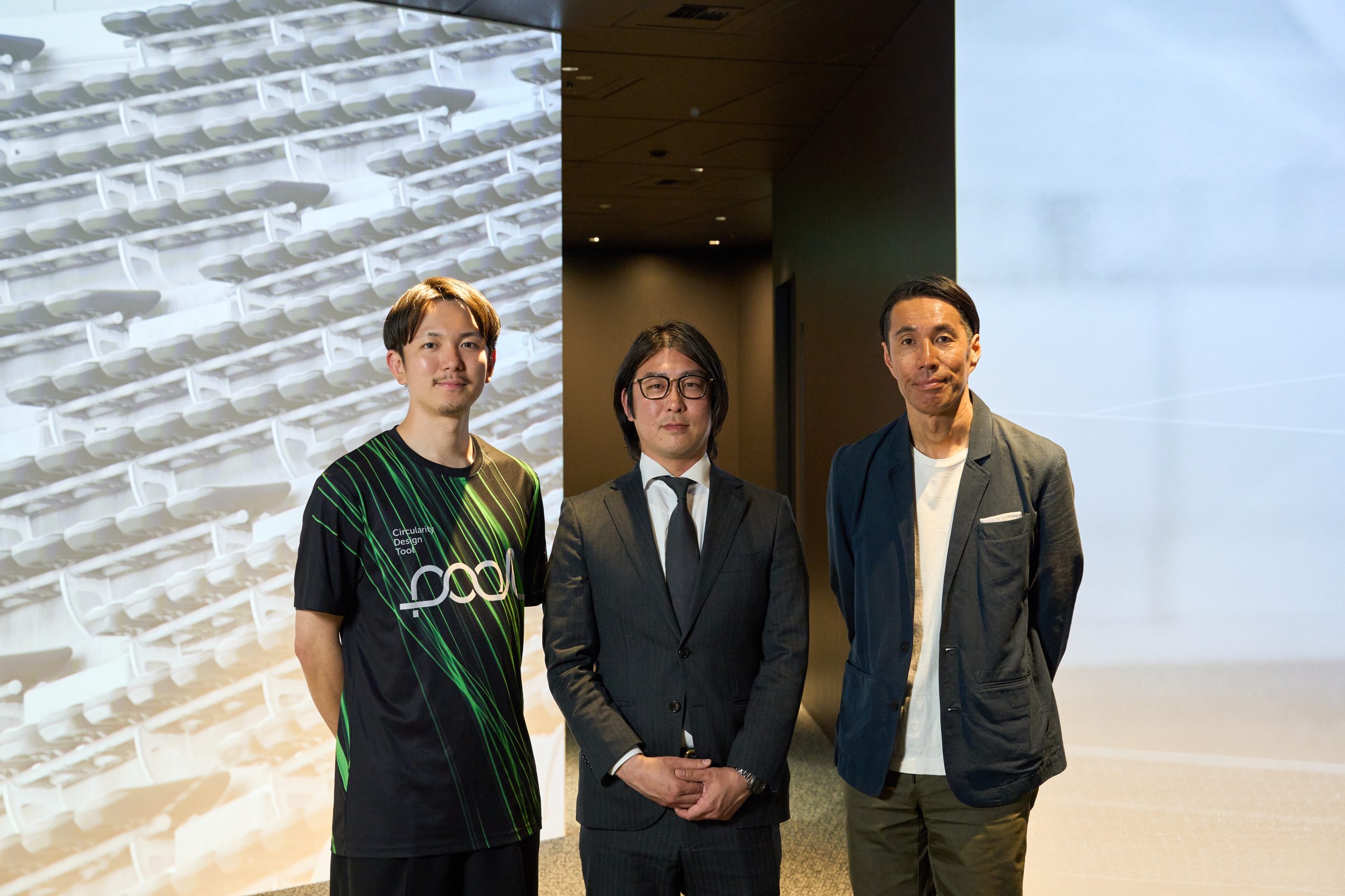 左からRECOTECH 大村拓輝さん、ヴィッセル神戸施設管理部部長 古賀圭紀さん、Jリーグ執行役員(サステナビリティ担当)辻井隆行さん。
