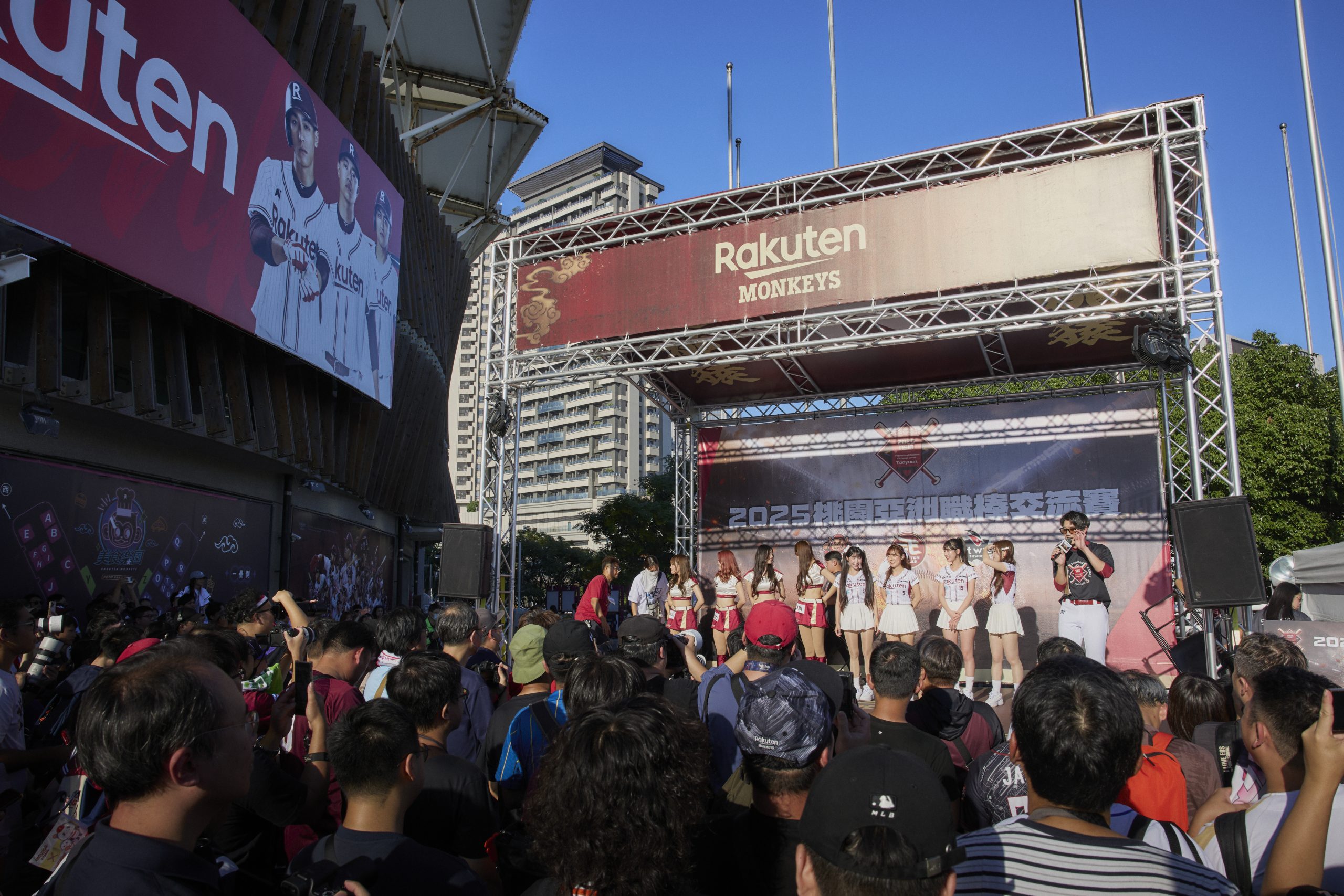 試合前のスタジアム周辺イベントも大盛況。楽天モンキーズのチアグループRakuten Girlsによる華やかなステージパフォーマンスや、ゲーム企画などが行われ、開場と同時に多くのファンでにぎわった。
