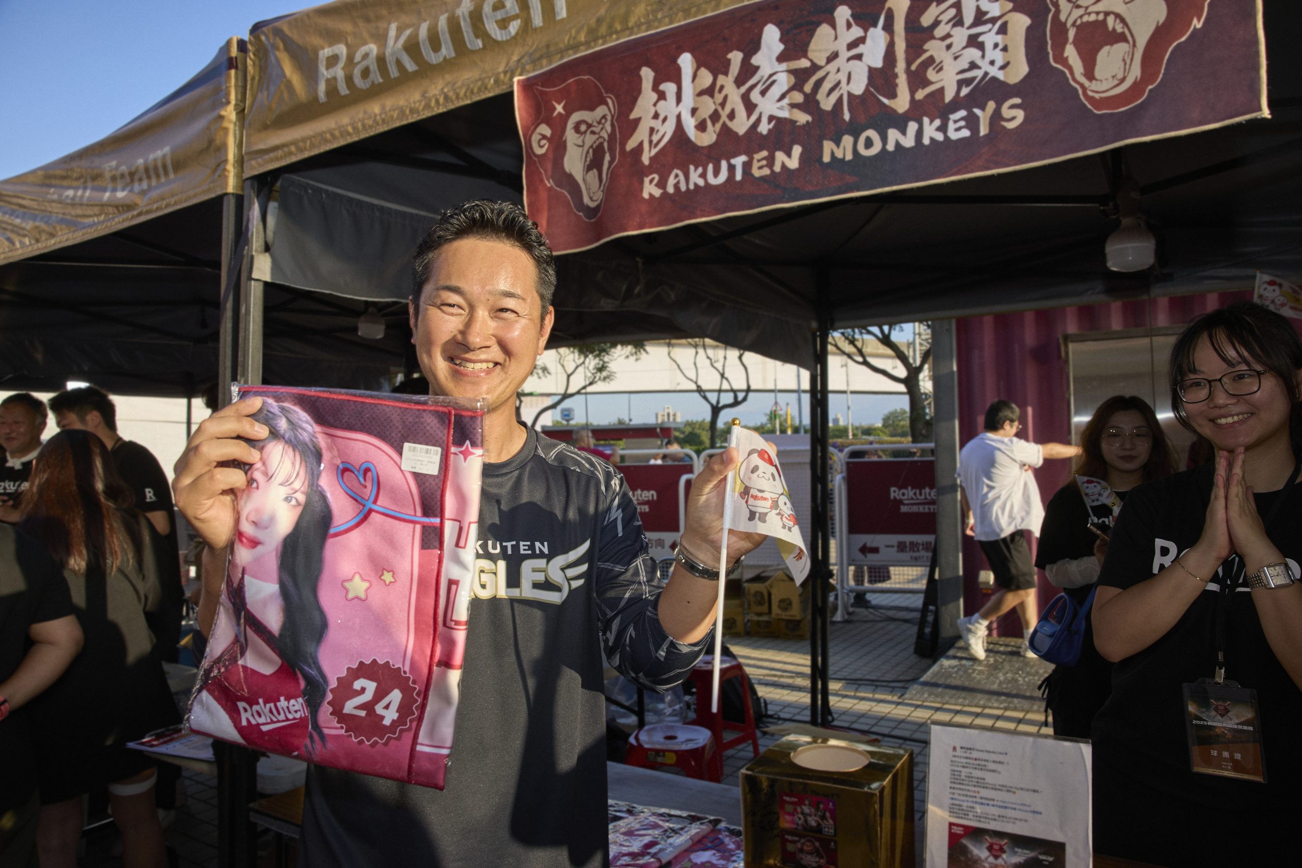 イベントコーナーでRakuten Girlsのタオルをゲットし、銀次アンバサダーもご満悦。