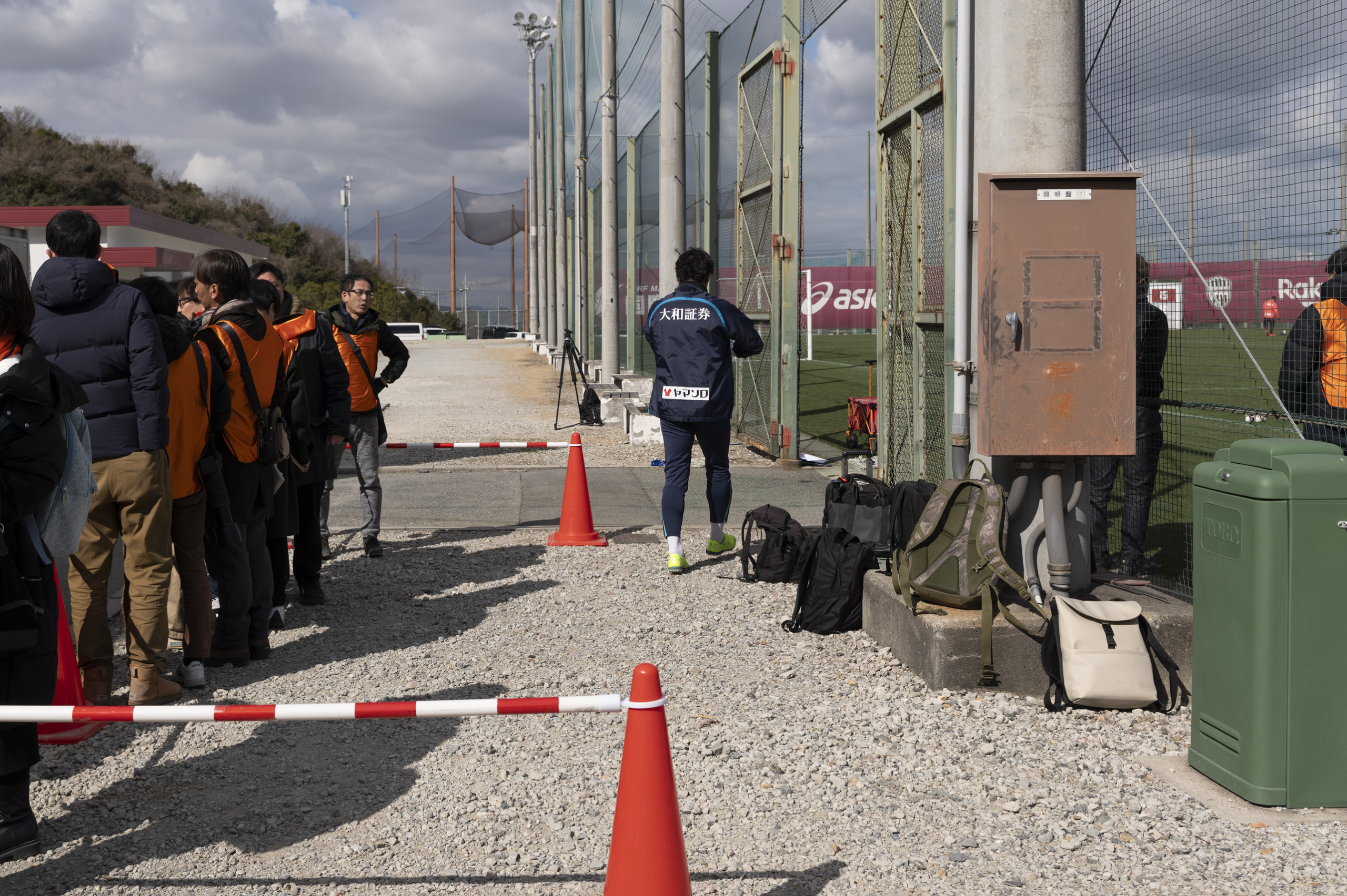 公開練習後、報道陣が練習後の選手たちを取り囲む傍を通って、一人、グラウンドへ。