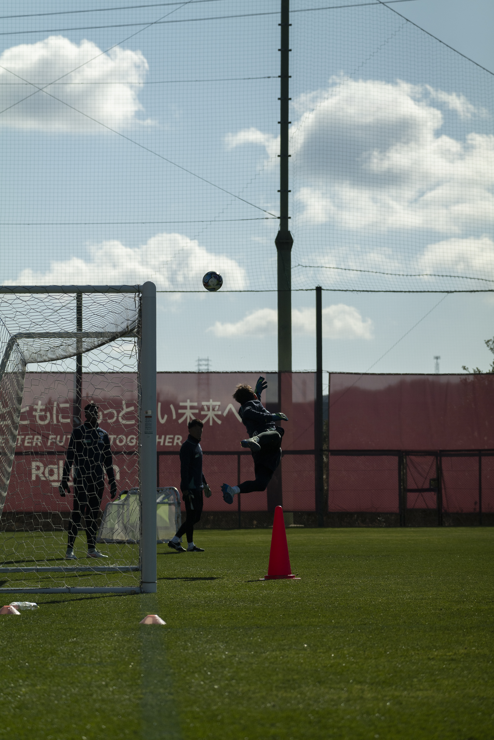 ゴールキーパーは、反復練習によって瞬発的な動きを体に覚えさせていく。常に体と対話が必要なポジション。同僚たちの練習を横目に、黙々とジョグを続けた。