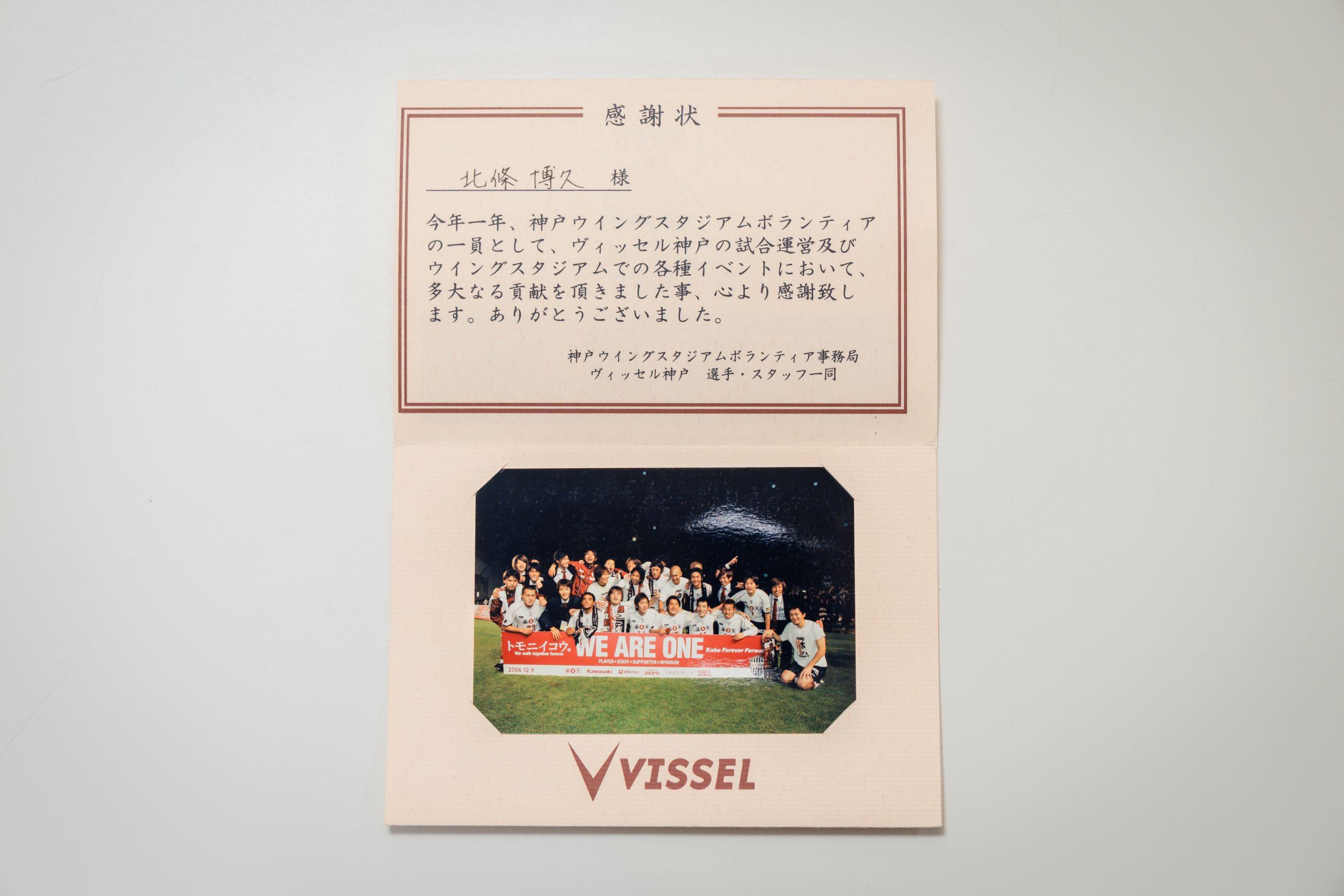 ヴィッセル神戸からもらった感謝状。