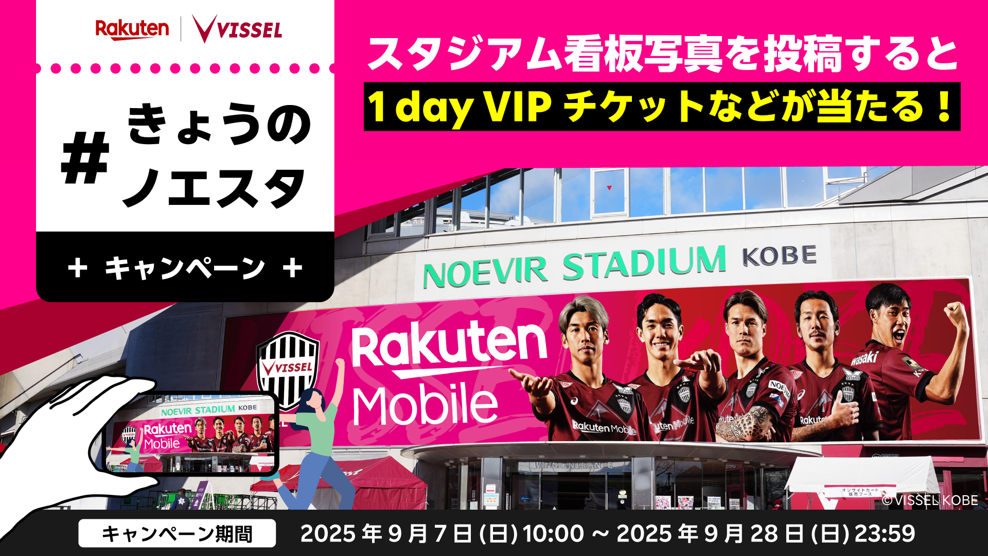 Xで「Rakuten Sports」の公式アカウント(@RakutenSportsJP)をフォローしていただき、ヴィッセル神戸5選手と「楽天モバイル」ロゴが入ったノエビアスタジアム神戸 スタジアム正面ビジュアルの写真を指定ハッシュタグと一緒にXに投稿いただくと、抽選で観戦チケットが当たります!