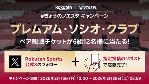楽天グループ株式会社では、2026年2月16日(月)よりオンラインでの「#きょうのノエスタ」キャンペーンを開催します。キャンペーン期間中に「Rakuten Sports」公式X(@RakutenSportsJP)をフォローし、指定の【投稿】をリポストするのみで応募が可能です。フォロー&リポストいただいた方の中から抽選で、プレミアム・ソシオ・クラブ(ペアチケット)を合計6組12名様にプレゼントします。
