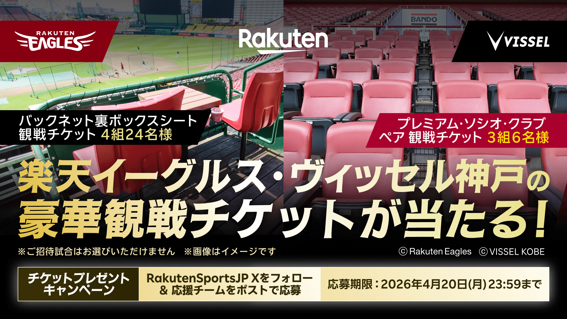 【2026年4月13日(月) 12:00 ~ 2026年4月20日(月) 23:59】@RakutenSportsJP をフォロー&応援チームのポストで、楽天イーグルス・ヴィッセル神戸の豪華観戦チケットを抽選でプレゼント!